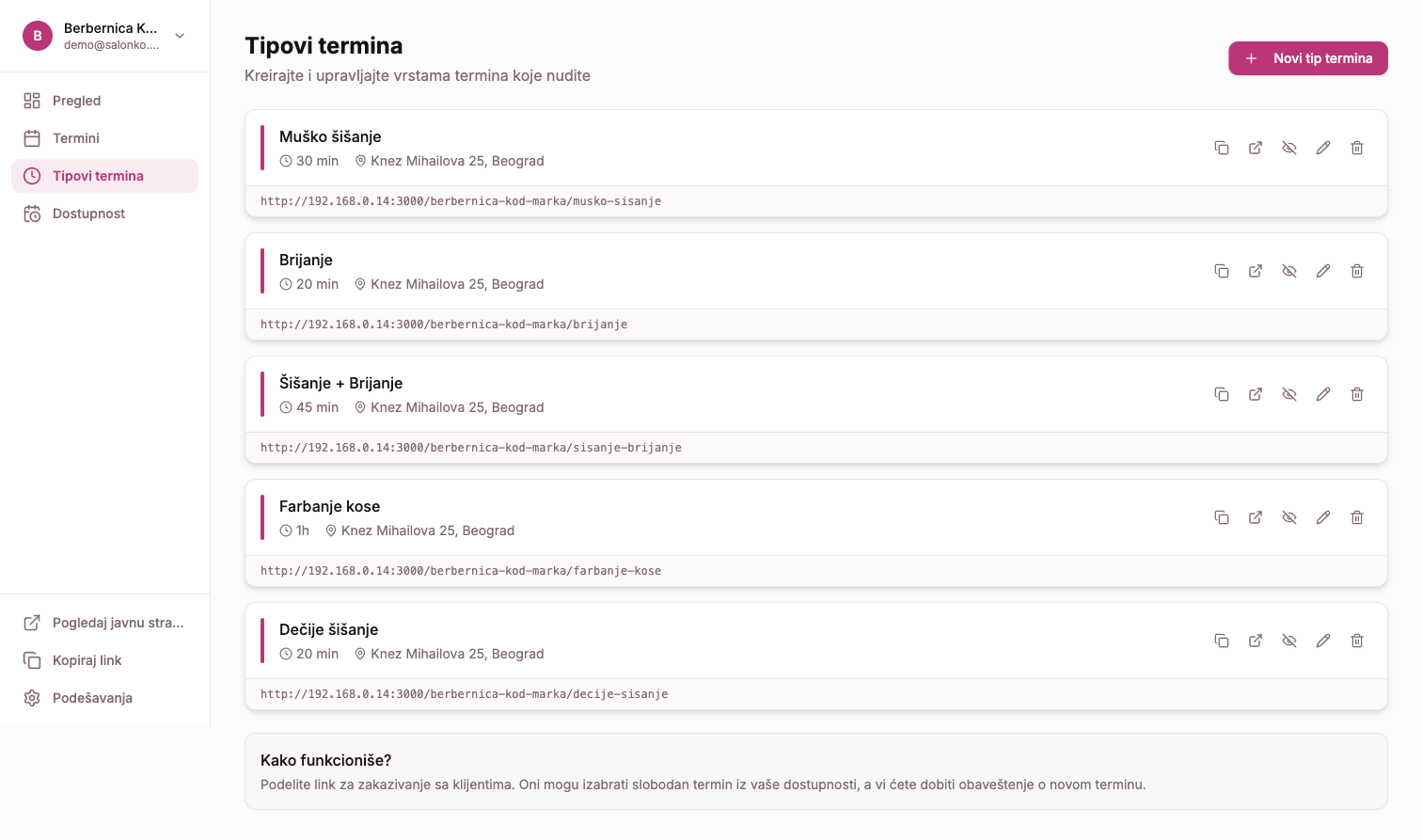 Ovaj link vodi na tvoju javnu stranicu gde su prikazane sve tvoje aktivne usluge. Klijent može izabrati uslugu i zakazati termin.