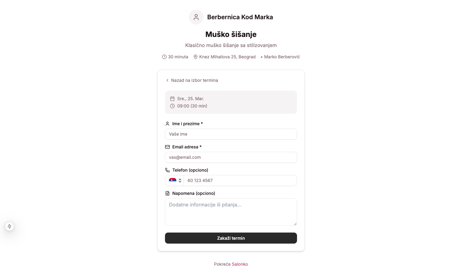 - Sajt salona — Dodaj dugme „Zakaži termin" koje vodi na tvoj Salonko link