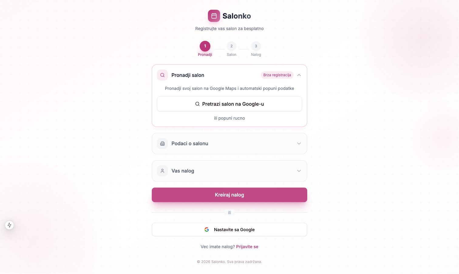 Ako želiš brži proces, klikni na Nastavite sa Google. Nakon Google prijave, bićeš preusmeren/a na stranicu gde trebaš da popuniš samo podatke o salonu (naziv, tip, grad, adresa, telefon).