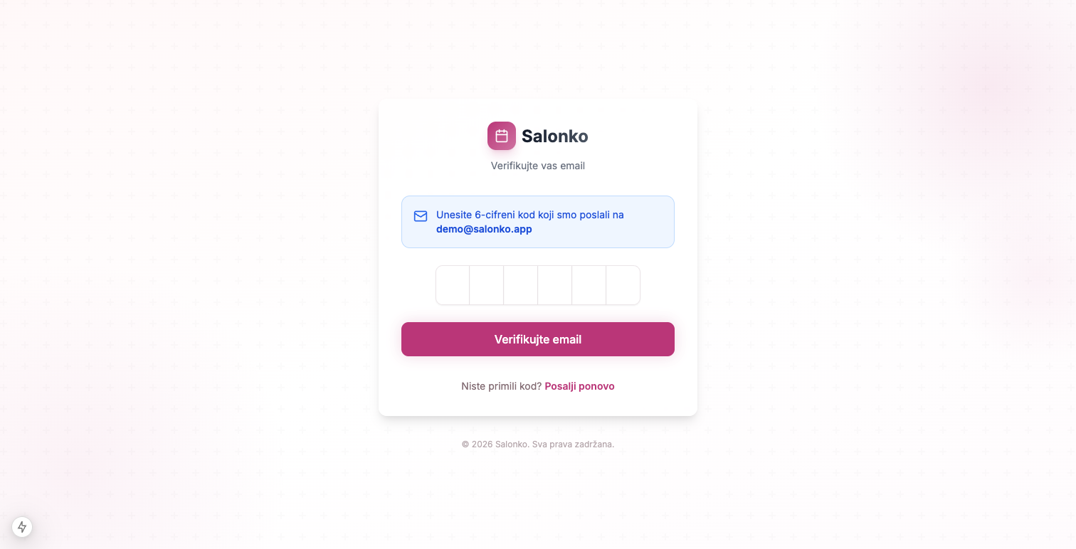 Idi na salonko.rs/signup ili klikni na dugme Započni besplatno na početnoj stranici.