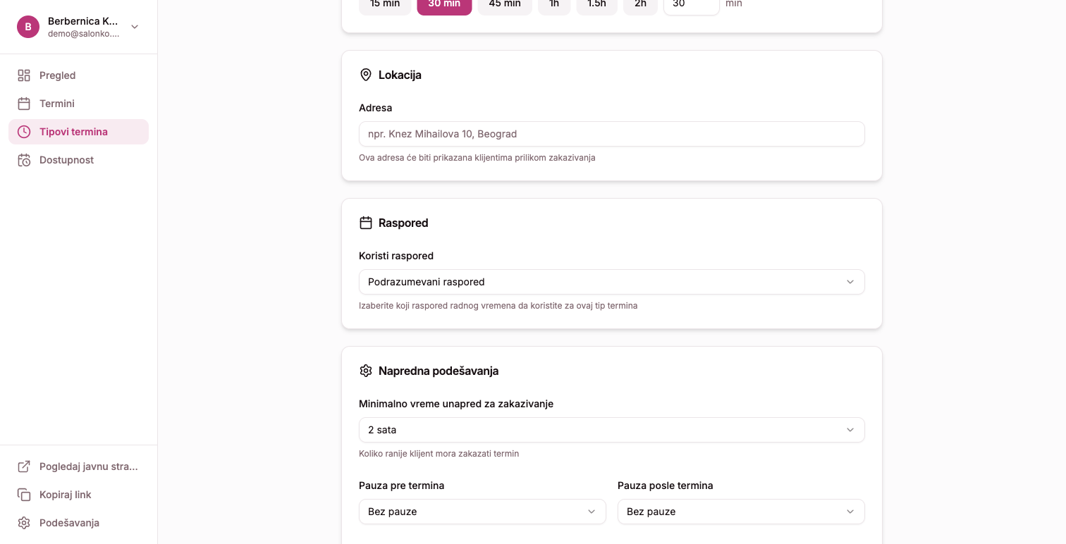 Tipovi usluga (termina) su osnova zakazivanja na Salonko platformi. Svaki tip usluge ima svoj link koji možeš podeliti sa klijentima.