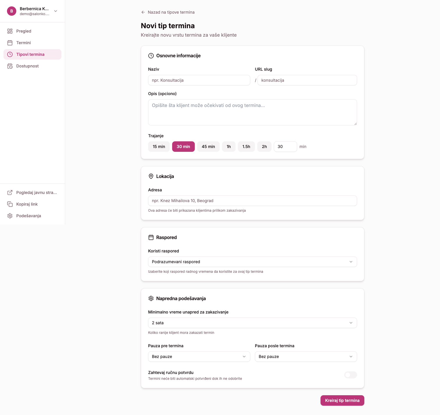 - URL slug — Automatski se generiše od naziva. Ovo je deo linka za zakazivanje (npr.