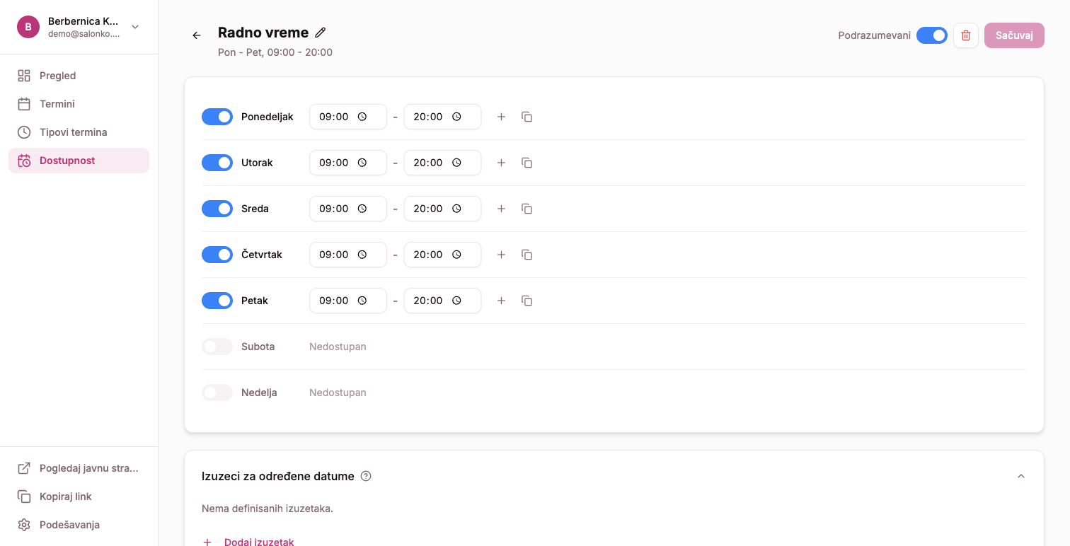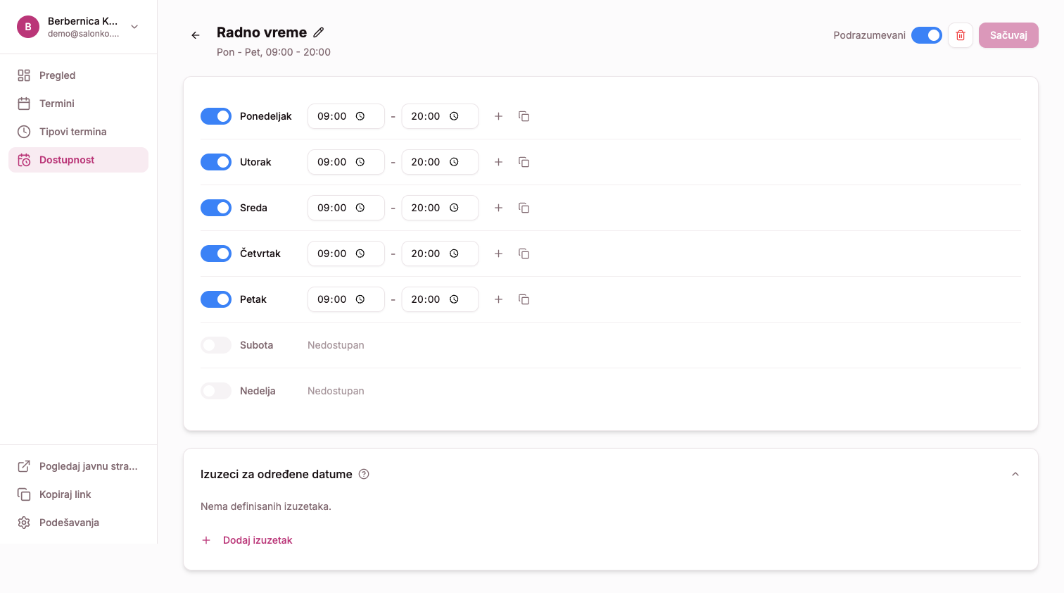 Koristi prekidač pored naziva dana da ga uključiš (radan) ili isključiš (neradan). Isključeni dani se neće prikazivati kao dostupni klijentima.