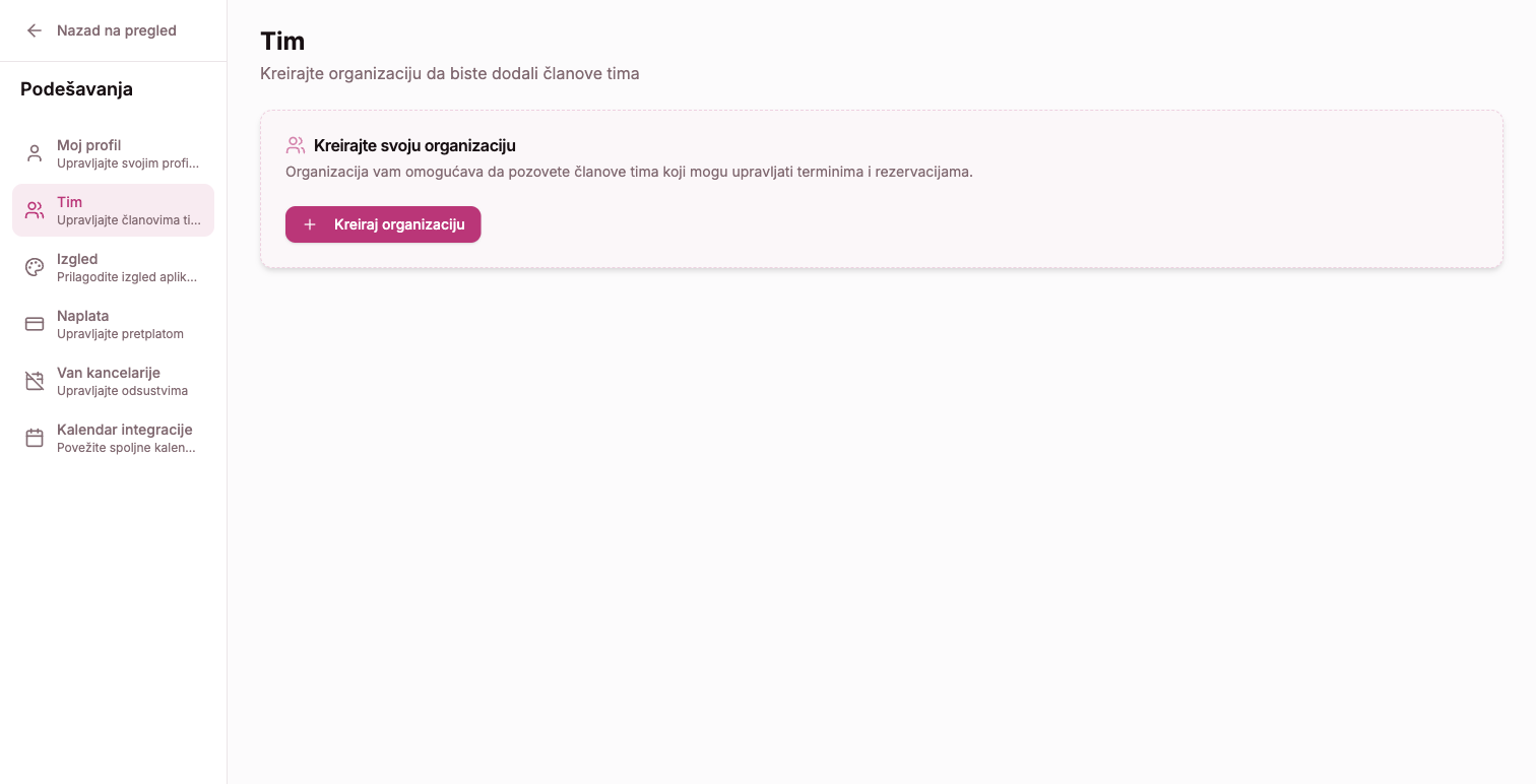 Prilikom kreiranja ili uređivanja tipa usluge, možeš izabrati koji članovi tima pružaju tu uslugu. Sistem će automatski prikazati samo dostupne termine za izabrane zaposlene.