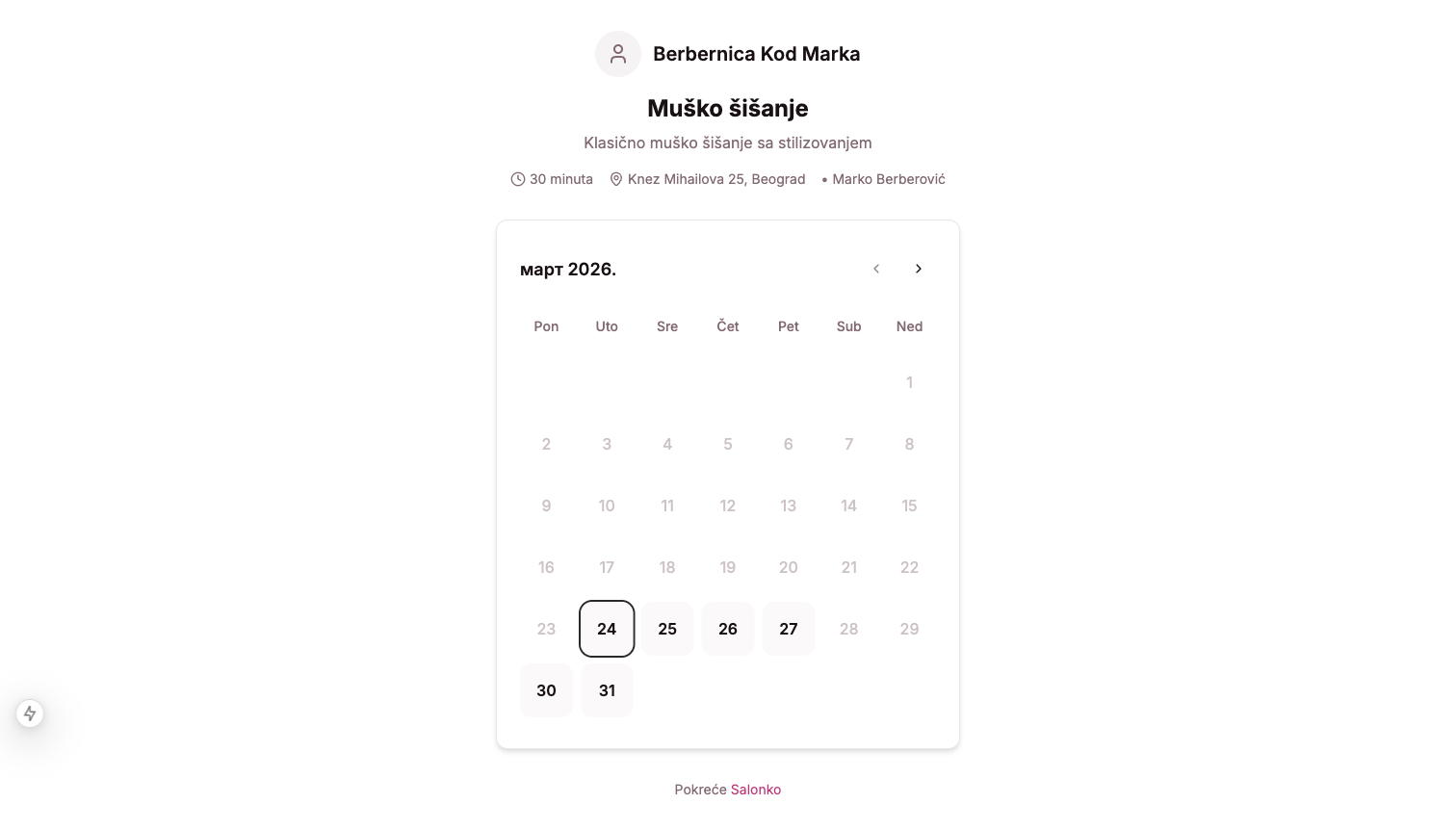 Klijent otvara link za zakazivanje koji si podelio/la (npr. salonko.rs/moj-salon ili salonko.rs/moj-salon/sisanje).