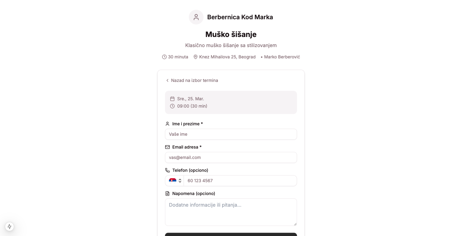 - Automatska potvrda (podrazumevano) — Termin je odmah potvrđen, a klijent vidi poruku „Termin je zakazan!"