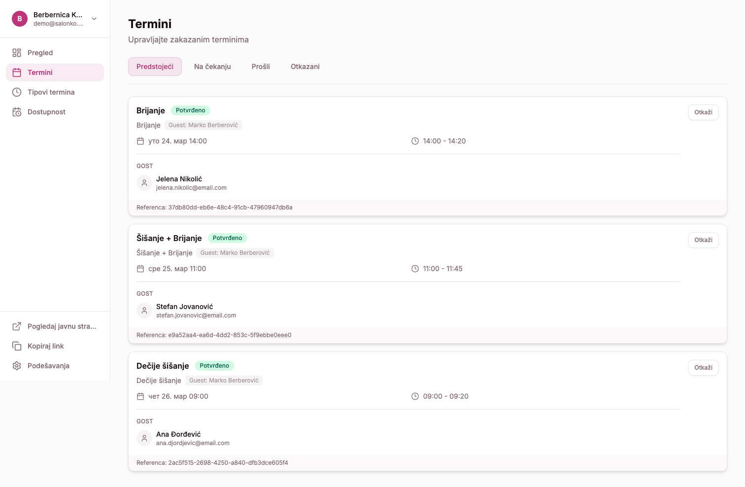Kontrolna tabla ti omogućava kompletan pregled i upravljanje svim terminima u tvom salonu.