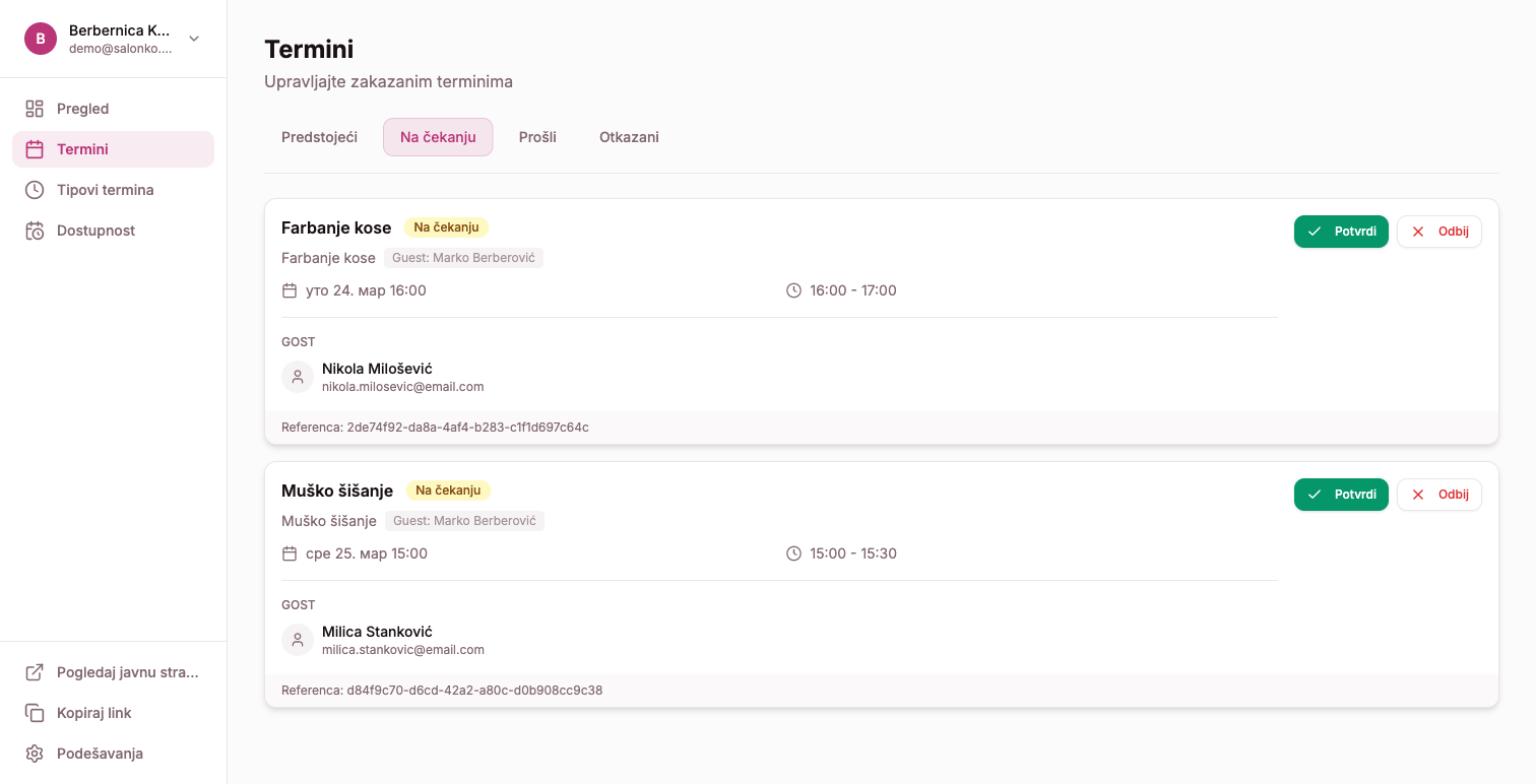 - Potvrdi — Odobrava termin i šalje klijentu email potvrdu